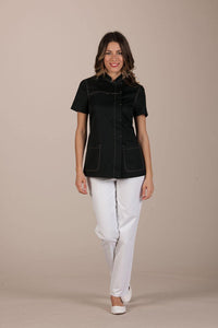 Beirut Woman is a lab coat tailored for discerning female professionals who value both style and function. Its sleek, contemporary silhouette pays homage to traditional designs while ensuring comfort and professionalism. The mandarin collar, fastened with hypoallergenic nickel-free buttons, combines ease of wear with distinctive elegance. Practicality is enhanced by spacious back pockets and a chest pocket, ideal for medical use. Crafted from 100% Levantine cotton, this coat comes in short or long sleeves, with the long-sleeve option featuring a soft, visually refined cotton knit cuff.