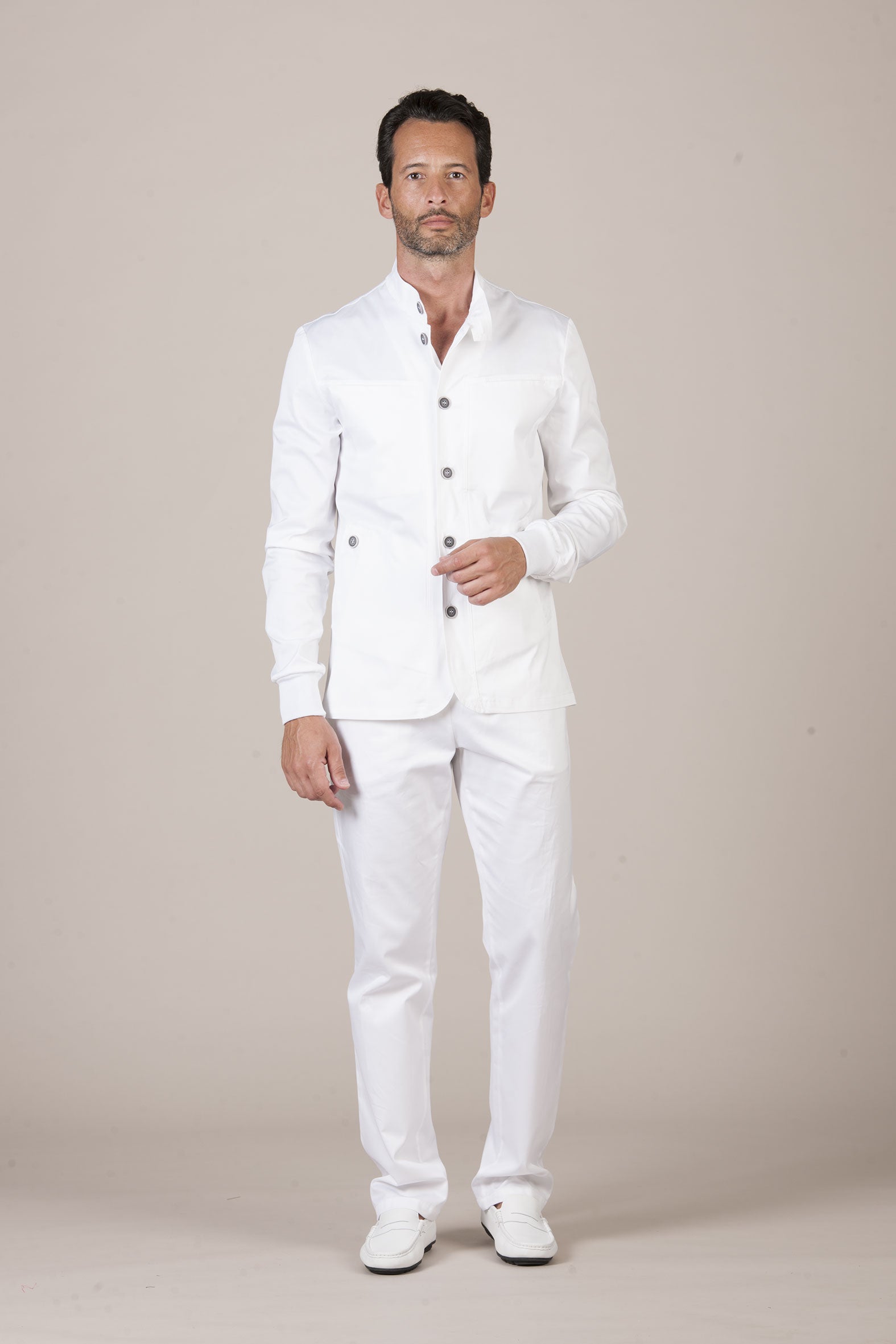 An English elegance reinterpreted with the Italian style. This men's jacket, with an innovative cut, full of small details that make it unique, a standard fit, a closure with black buttons, presents particular profile breast pockets and lower pockets on the sides enhanced by a button closure.
